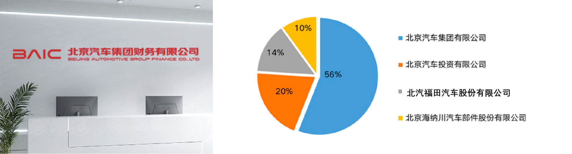 ”)是2011年10月经中国银行业监督管理委员会批准成立的非银行金融机构,是北京市属国有企业中第一家申请新设的财务公司,由北京汽车集团有限公司、北京汽车投资有限公司、北汽福田汽车股份有限公司和北京海纳川汽车部件股份有限公司共4家股东单位发起设立,其中北京汽车集团有限公司持股比例56%、北京汽车投资有限公司持股比例20%、北汽福田汽车股份有限公司持股比例14%、北京海纳川汽车部件股份有限公司持股比例10%,注册资本金50亿元人民币。